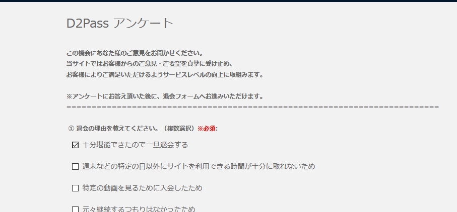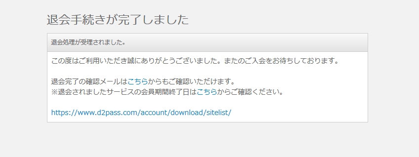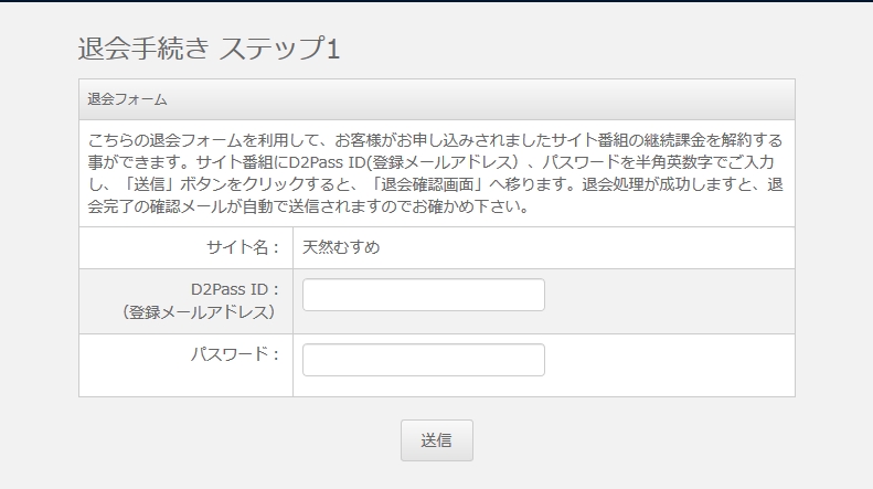 退会フォームを利用して、申し込みサイト番組の継続課金を解約する事ができます。サイト番組にご登録されたサイトユーザー名又は、D2Pass ID(登録メールアドレス)、パスワード、Eメールアドレスを英数半角文字でご入力し、「送信」ボタンをクリックすると、「退会確認画面」へ移ります。退会処理が成功しますと、退会完了の確認メールが自動で送信されます