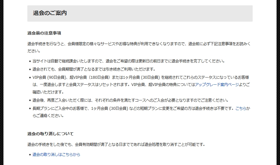 注意点としては、退会処理は契約更新日の前日までに完了してください。